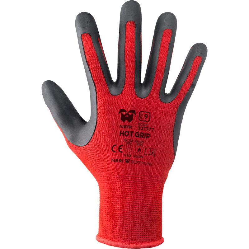 Bezszwowe rękawice nylonowo-elastanowe pokryte termoplastyczną gumą, czerwono-czarne