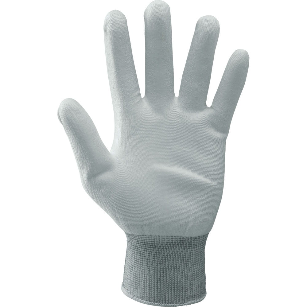 BEZSZWOWE RĘKAWICE POLIESTROWE POKRYTE PU PO WEWNĘTRZNEJ STRONIE DŁONI, LEKKIE , ODPORNE NA PRZETARCIA, DZIANY PRZEWIEWNY WIERZCH I MANKIET, KOLOR BIAŁY, MODEL 13 ECO-PU, 9