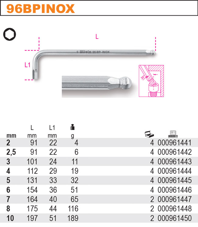 KLUCZ TRZPIENIOWY KĄTOWY SZEŚCIOKĄTNY Z KULISTĄ KOŃCÓWKĄ, STAL INOX AISI 420, MODEL 96BPINOX, 2,5MM